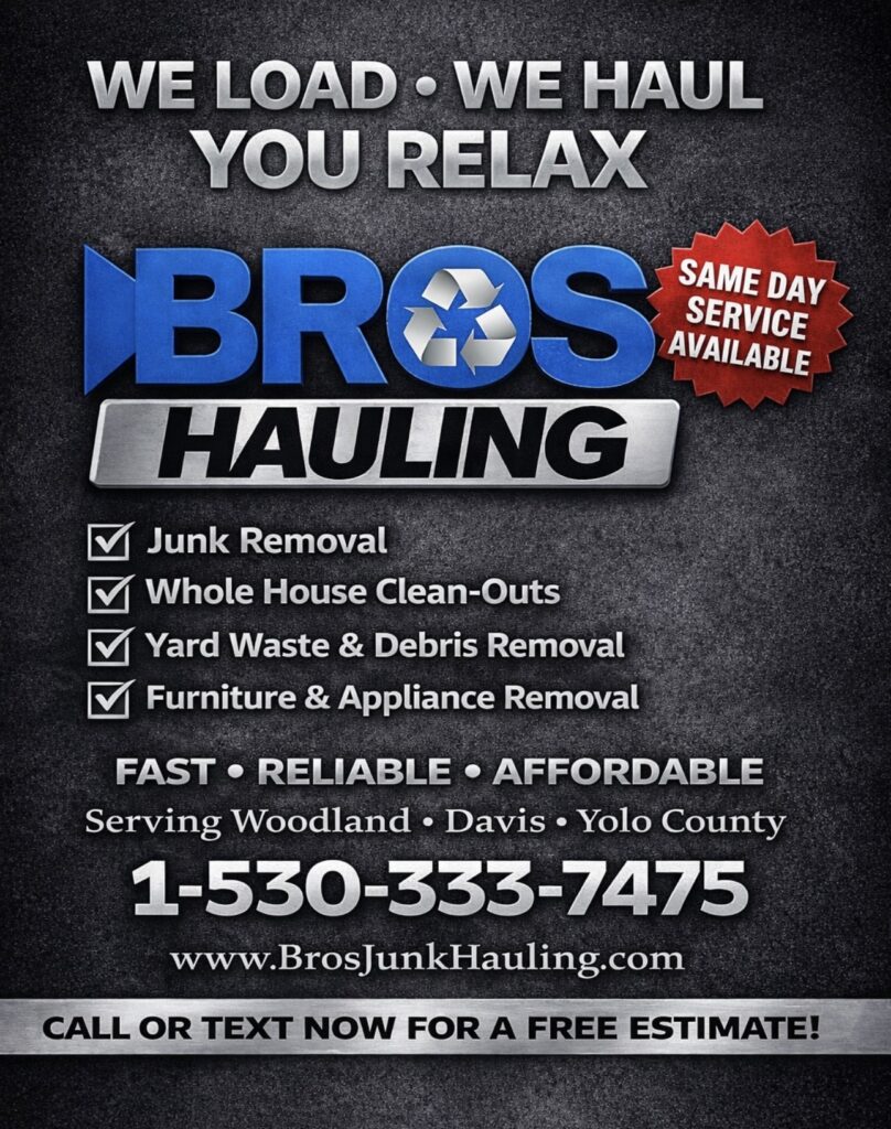 Bro’s Junk Removal services Davis, CA, and the surrounding areas in Yolo County. We are a family-owned and operated small junk removal business dedicated to providing on-budget, clean, honest debris removal services to our customers. What sets us apart from our competition is that we are personable, locally owned, honest, and dependable. Our customers highlight the ease of obtaining an estimate, fair pricing, and dependability. If you’re looking to clean up the inside or outside of your home and need junk removal services, call us or text us at 1-530-333-7475.